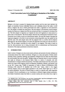 “Anti-Conversion Laws: Is it a Challenge to Secularism of the Indian Constitution”; Vaishnavi Joshi, Manipal University, Jaipur [https://doi-ds.org/doilink/11.2021-39131956/P17/021/004]